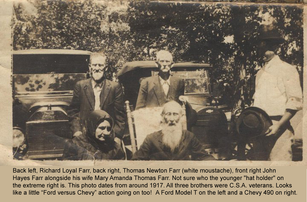 Back left, Richard Loyal Farr, back right, Thomas Newton Farr (white moustache), front right John Hayes Farr alongside his wife Mary Amanda Thomas Farr, c. 1917 (click photo for larger image).